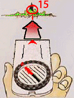 - 3- prendre la boussole à la main (la carte n'est plus nécessaire) et se tourner jusqu'à faire coïncider le Nord de l'aiguille aimantée avec les lignes Nord-Sud de la capsule.