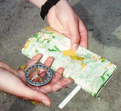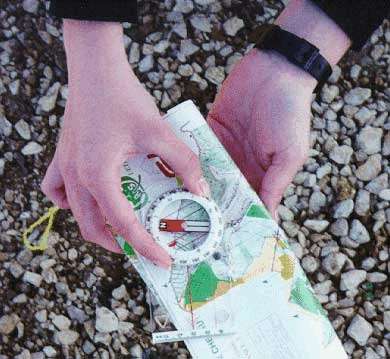 - 3- La carte est alors dans la bonne position; elle est orientée. Le corps se trouve derrière la carte et le regard est désormais dirige dans le sens du déplacement. Si on lève les yeux, on regarde dans la direction du poste.